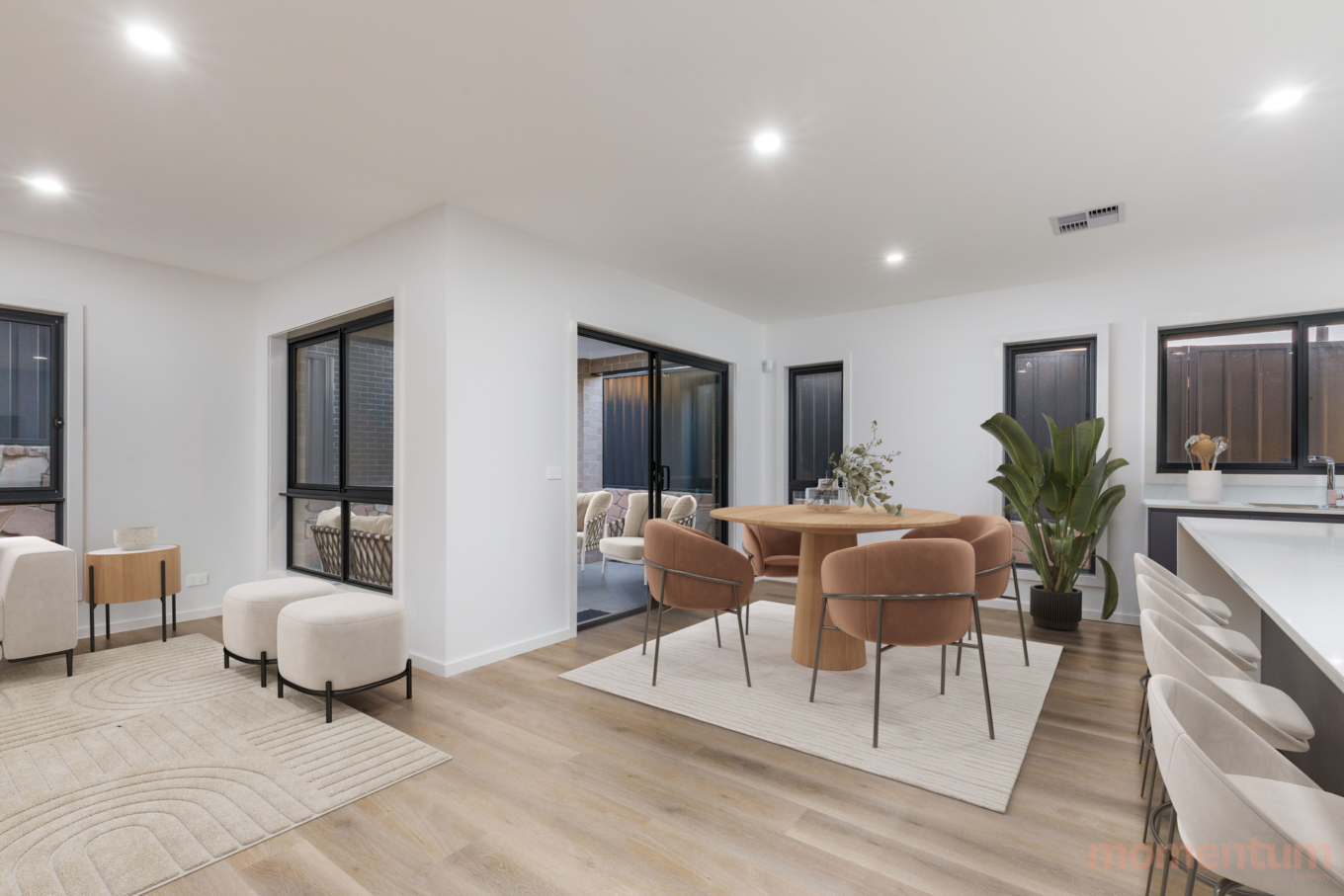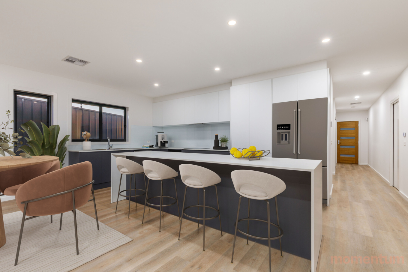 As you enter, you’re welcomed by the master bedroom complete with a walk-in robe and ensuite. Flowing through the hallway, the open-plan kitchen, dining, and living area create a warm, inviting space that seamlessly connects to the alfresco – perfect for year-round entertaining. Completing the ground floor are a powder room, laundry, and a generous double garage.