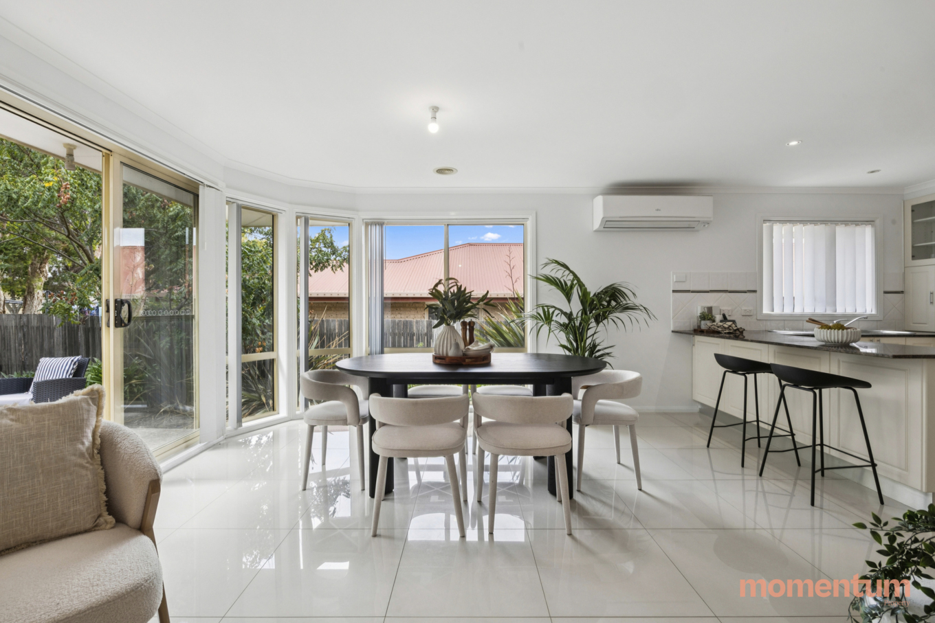Stepping inside, you are welcomed into the light-filled lounge and dining area – a comfortable space perfect for relaxing or entertaining guests.