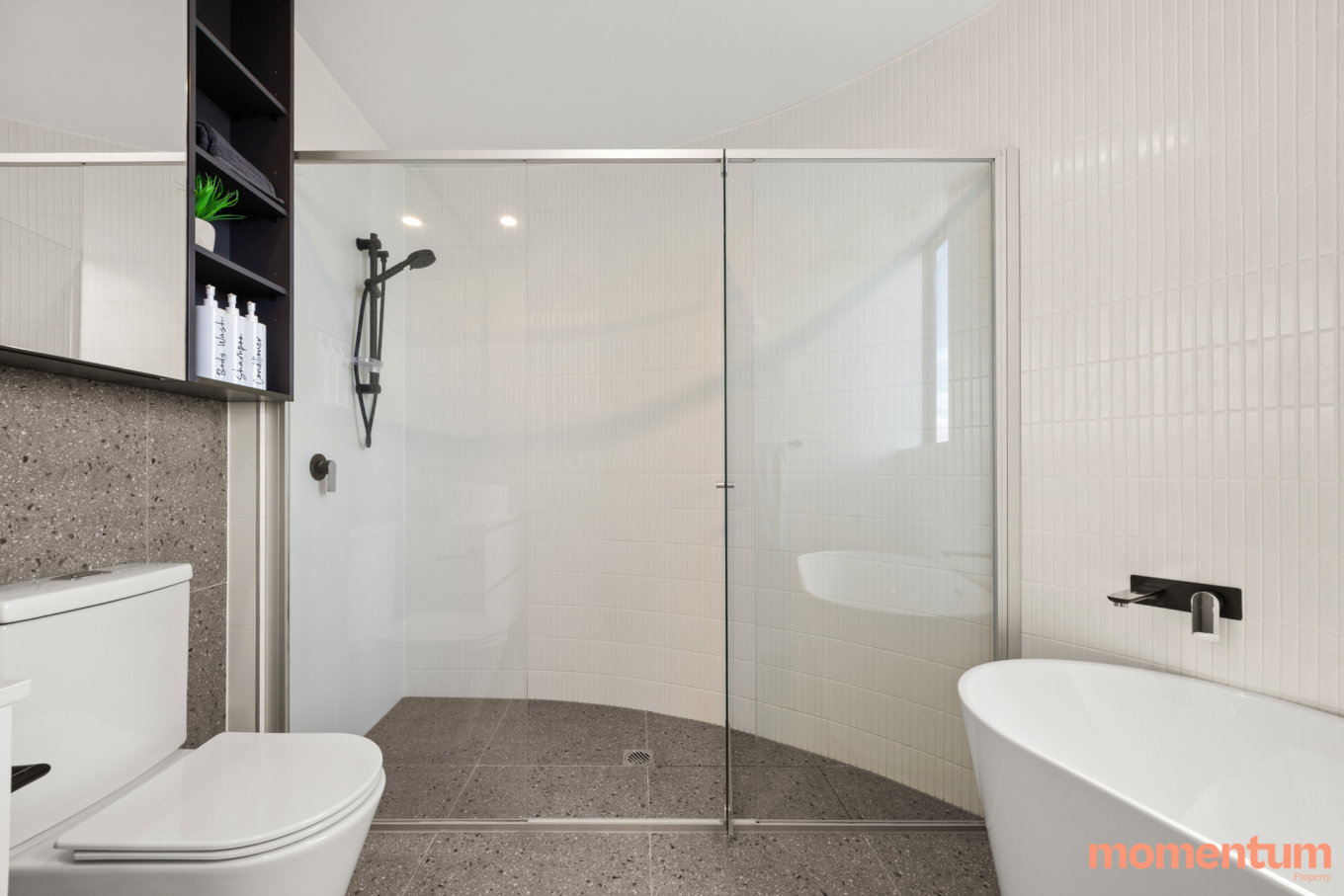 Accommodation includes two spacious bedrooms both with mirror built in robes. The main bedroom is complete with built-in robes and a modern, generously sized ensuite featuring a bathtub.