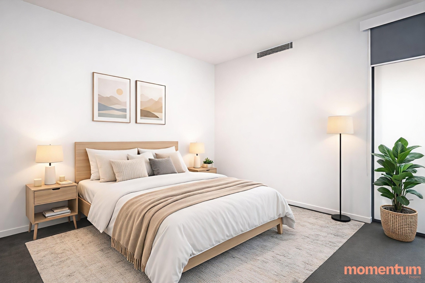 – Under‑roll translucent blinds to living area & block‑out roller blinds to bedroom