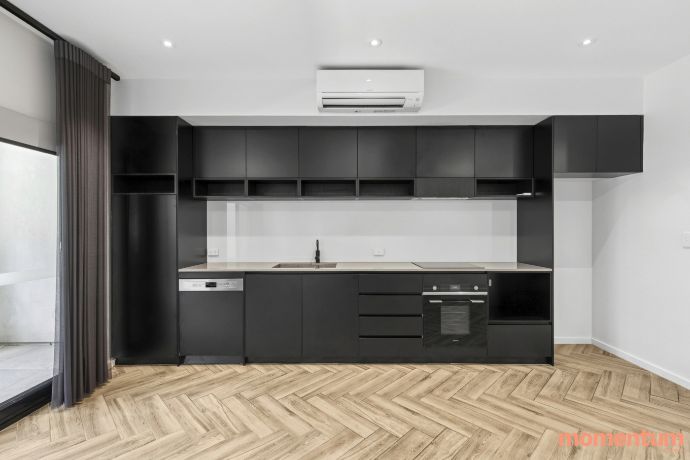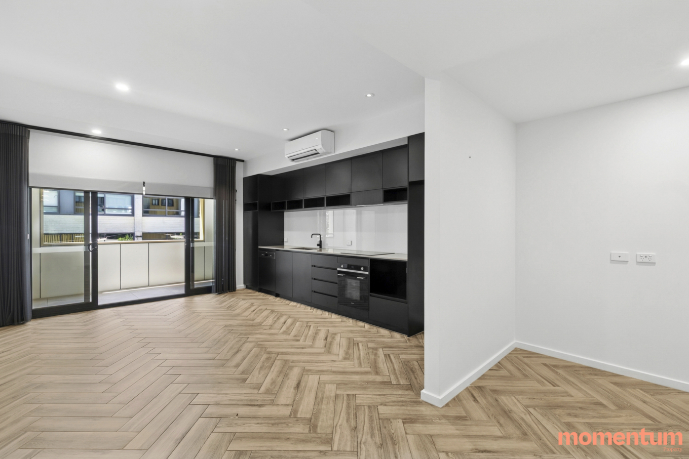 The open-plan living and dining area flows out to a balcony, while the sleek kitchen is equipped with quality appliances including an electric cooktop and dishwasher, complemented by good storage.