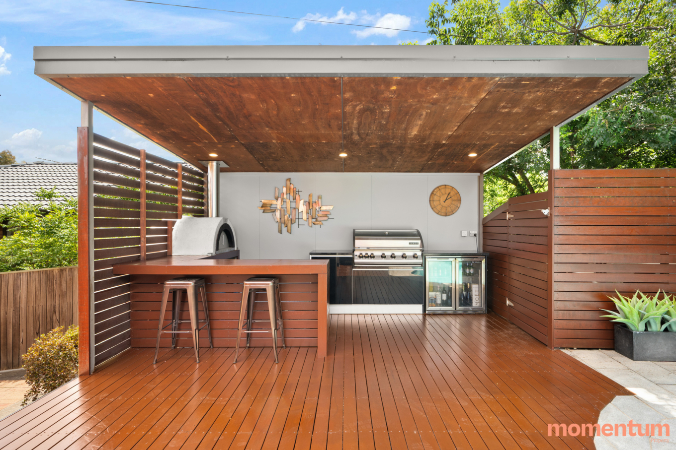 – Covered alfresco with built in BBQ, bar seating and pizza oven