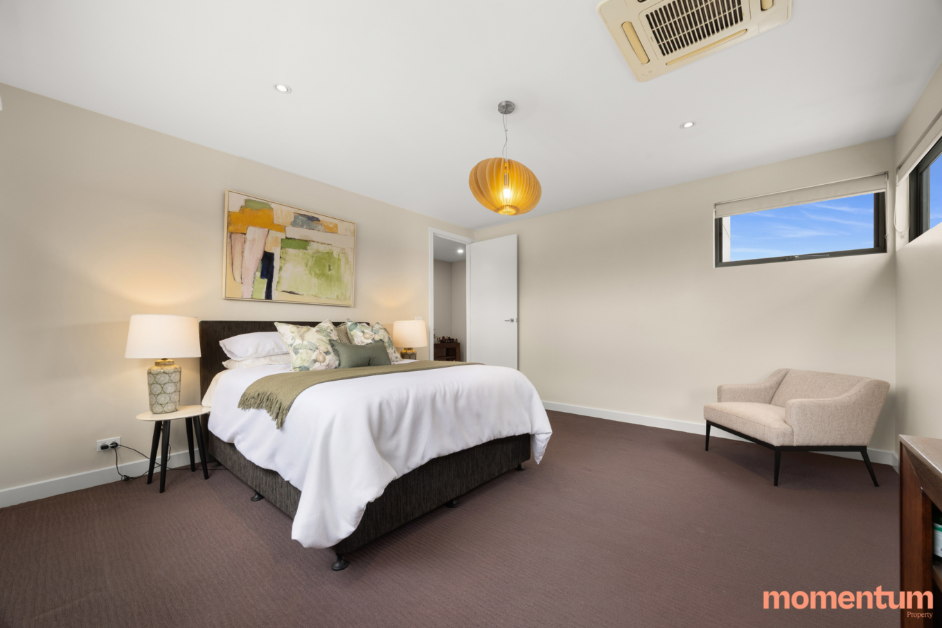 Privately positioned on the upper level, the main suite serves as a true retreat. Generous in scale, it offers a walk-in robe and a beautifully appointed ensuite, with elevated views enjoyed from both the bedroom and bathroom. It is a serene sanctuary where each day begins with light, outlook and quiet contemplation.