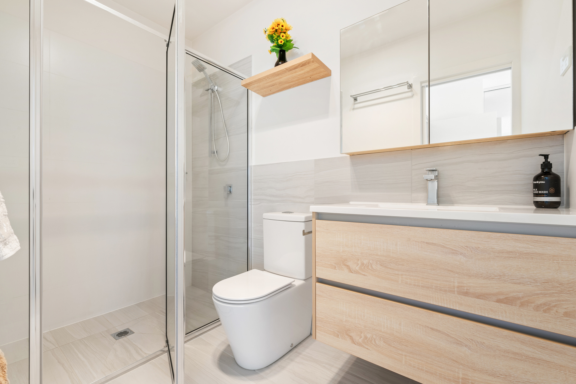 Upstairs, all three bedrooms come with mirrored built-in wardrobes. The main bedroom features a generous ensuite, while the other two bedrooms are serviced by the modern main bathroom.